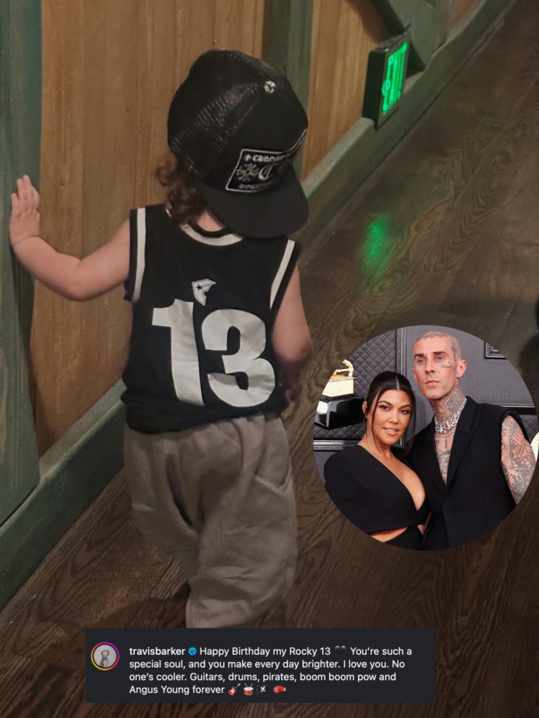 Travis Barker, 49, shared a touching tribute on Instagram to honor his youngest son’s birthday. The post featured a photo of Rocky wearing a jersey with the number 13 and a backwards cap, perfectly fitting for the little one whose middle name pays homage to that lucky number. “Happy Birthday my Rocky 13 🖤. You’re such a special soul, and you make every day brighter. I love you,” Barker wrote. He continued with a playful nod to Rocky’s interests, adding, “No one’s cooler. Guitars, drums, pirates, boom boom pow and Angus Young forever 🎸🥁🏴☠️ 🥊.”